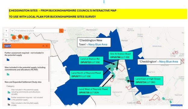 BLUE = due to have further analysis and may not necessarily go forward - No site reference numbers so use 'Cheddington' and 'Cheddington New Town'